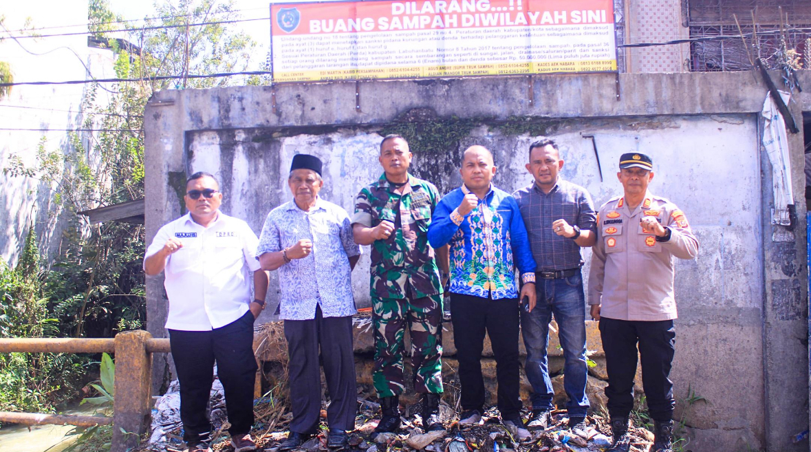 Wujudkan Labuhanbatu Bersih, DLH dan Unsur Muspika Pasang Spanduk Larangan Buang Sampah di Aek Nabara